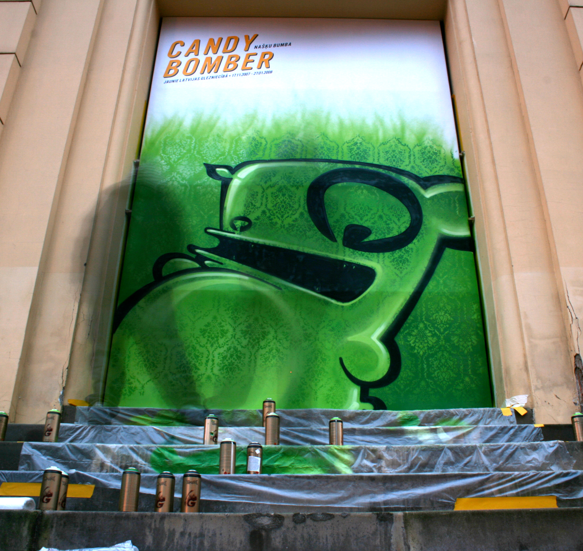I couldn’t find any instances where Grandpa actually painted over somebody else’s work, but it’s clear he went on a rampage that year. From the photo timestamps I dug up, sometimes he would go out painting for three nights in a row, sleep all day, then wake up at dusk to continue his quest. That’s how committed he was to painting more. Nobody knows why. In the middle of this frenzy, he went to Paris for the first time to paint at a school event. I guess some teachers there fancied him. I remember stories about him painting at night in Paris and losing his keys, so he slept on a doormat - nothing unusual here. He also took part in the local Baltic Graffiti Festival 2007, the Candy Bomber Exhibition at Arsenāls, and managed to sneak into various underground events like SDM [Stupid Dance Music] in Kandava, where he painted multiple walls while the party was in full swing and people had to evacuate outside because of the paint fumes, and Grandpa’s Garage in Andrejsala, hosted by Dirty Deal. At the end of the year, together with artist AMC, he hosted his first-ever exhibition, Mind Infection, featuring recently painted artworks.