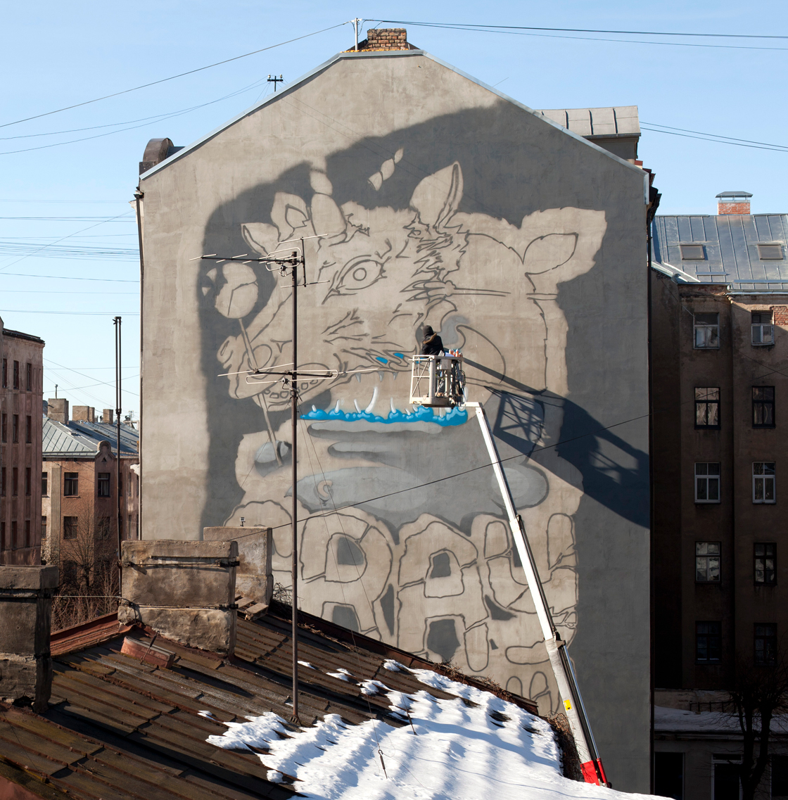 At this point, Grandpa discovered the Internet. He started posting pictures online, they gained some traction, and soon he was invited to visit France again. This time he joined fellow artists from all around the world to live in the mountains for a while, make art, calm down, and meditate. It didn’t help. He came back with a gorilla mask he found in the mountains and was even more hyped to paint. Together with his sketchy friends, he took part in Latvia’s first-ever Write for Gold 2008 graffiti festival. Then he zipped off to Poland, where he painted a tunnel in Białystok, before returning straight into Positivus Festival 2008. Rumor has it he slept in a tent, using boxes of spray paint as a mattress - some serious acupressure practice.