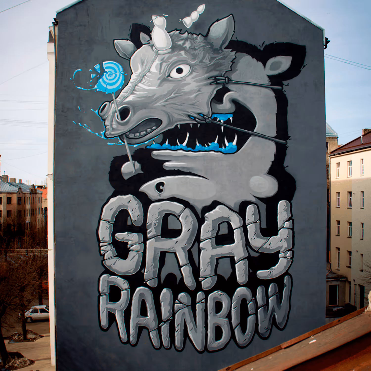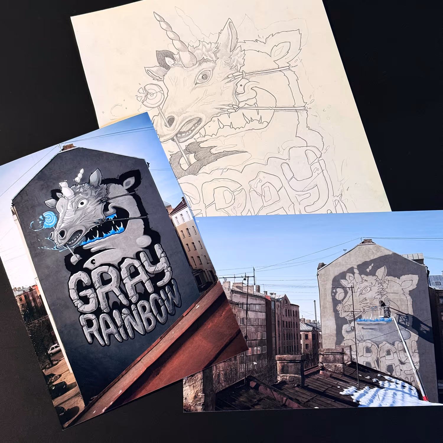 This is the original concept sketch for the mural titled Gray Rainbow, created for Grandpa’s multi-country exhibition Gray Rainbow, which was simultaneously held in Latvia, Germany, Poland, Estonia, and France. Trailer here. The sketch was never finished.