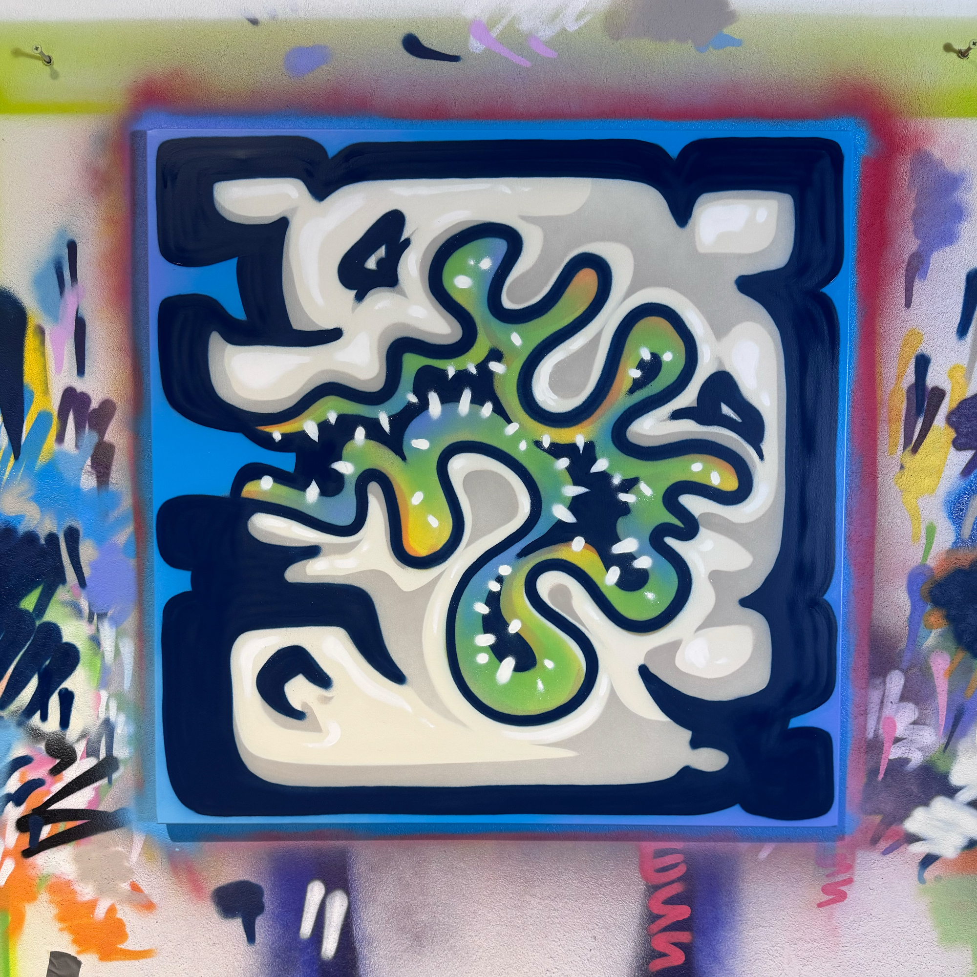 Artwork is part of the KIWIE paintings collection "DISTURBED" which reflects the constant pressure of the corporate system, compressing the artist into spaces too small to breathe.