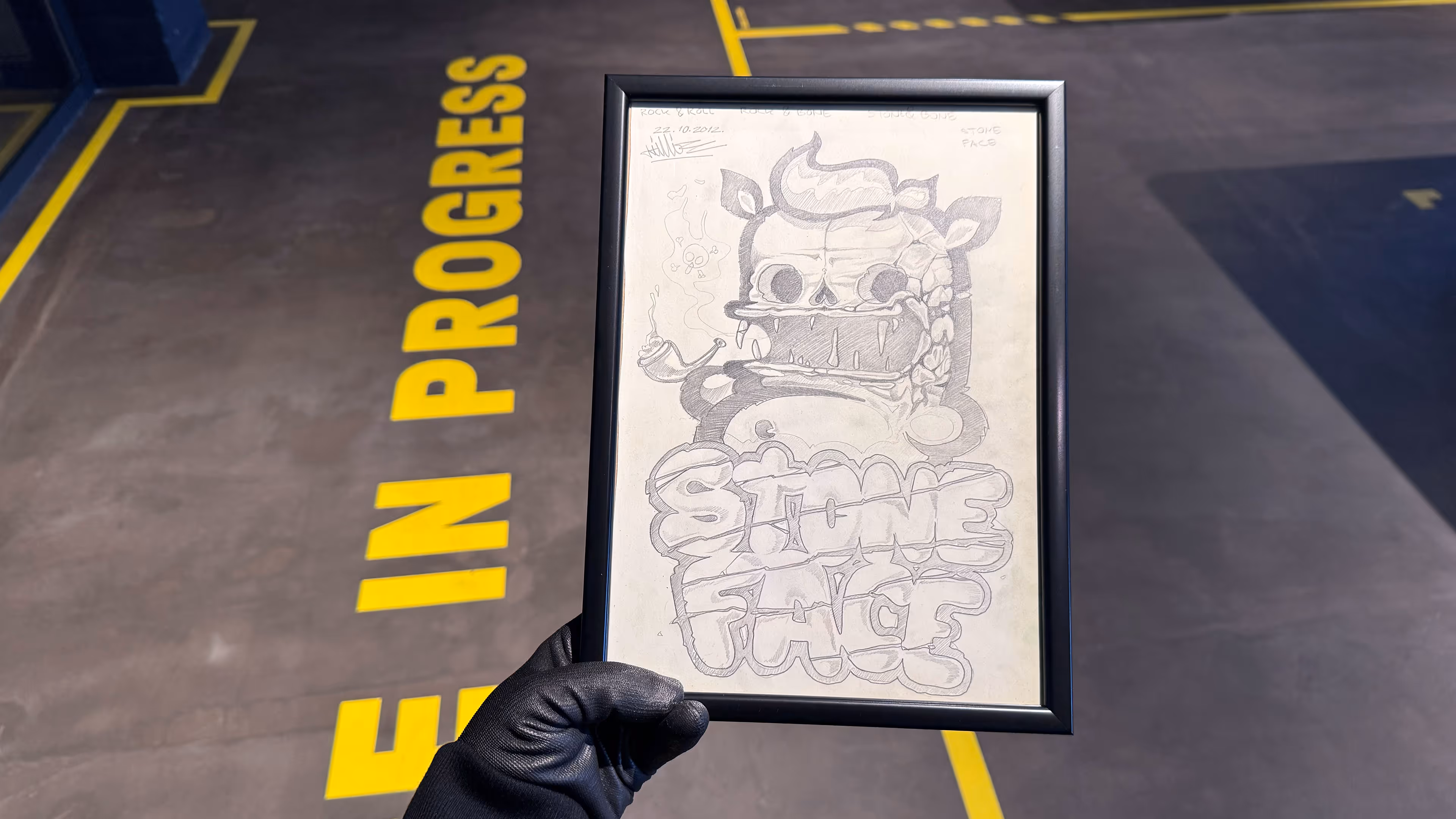 This is the original sketch behind “Stone Face”, one of the key illustrations from the Gray Rainbow digital artwork collection. The piece later evolved into a limited-edition T-shirt series and was also featured in a custom-painted car project, blending fashion, street art, and automotive design into one cohesive story. See the process here.