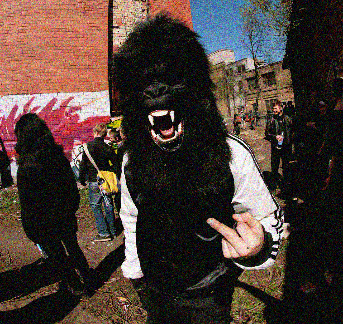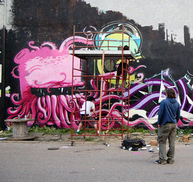 At this point, Grandpa discovered the Internet. He started posting pictures online, they gained some traction, and soon he was invited to visit France again. This time he joined fellow artists from all around the world to live in the mountains for a while, make art, calm down, and meditate. It didn’t help. He came back with a gorilla mask he found in the mountains and was even more hyped to paint. Together with his sketchy friends, he took part in Latvia’s first-ever Write for Gold 2008 graffiti festival. Then he zipped off to Poland, where he painted a tunnel in Białystok, before returning straight into Positivus Festival 2008. Rumor has it he slept in a tent, using boxes of spray paint as a mattress - some serious acupressure practice.