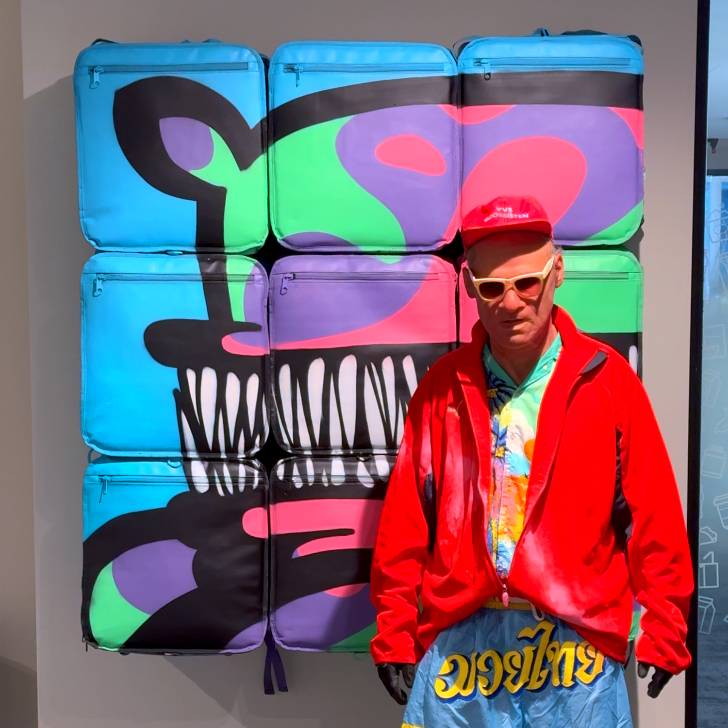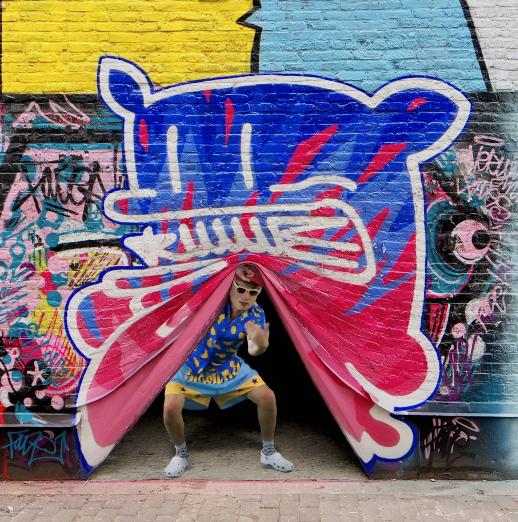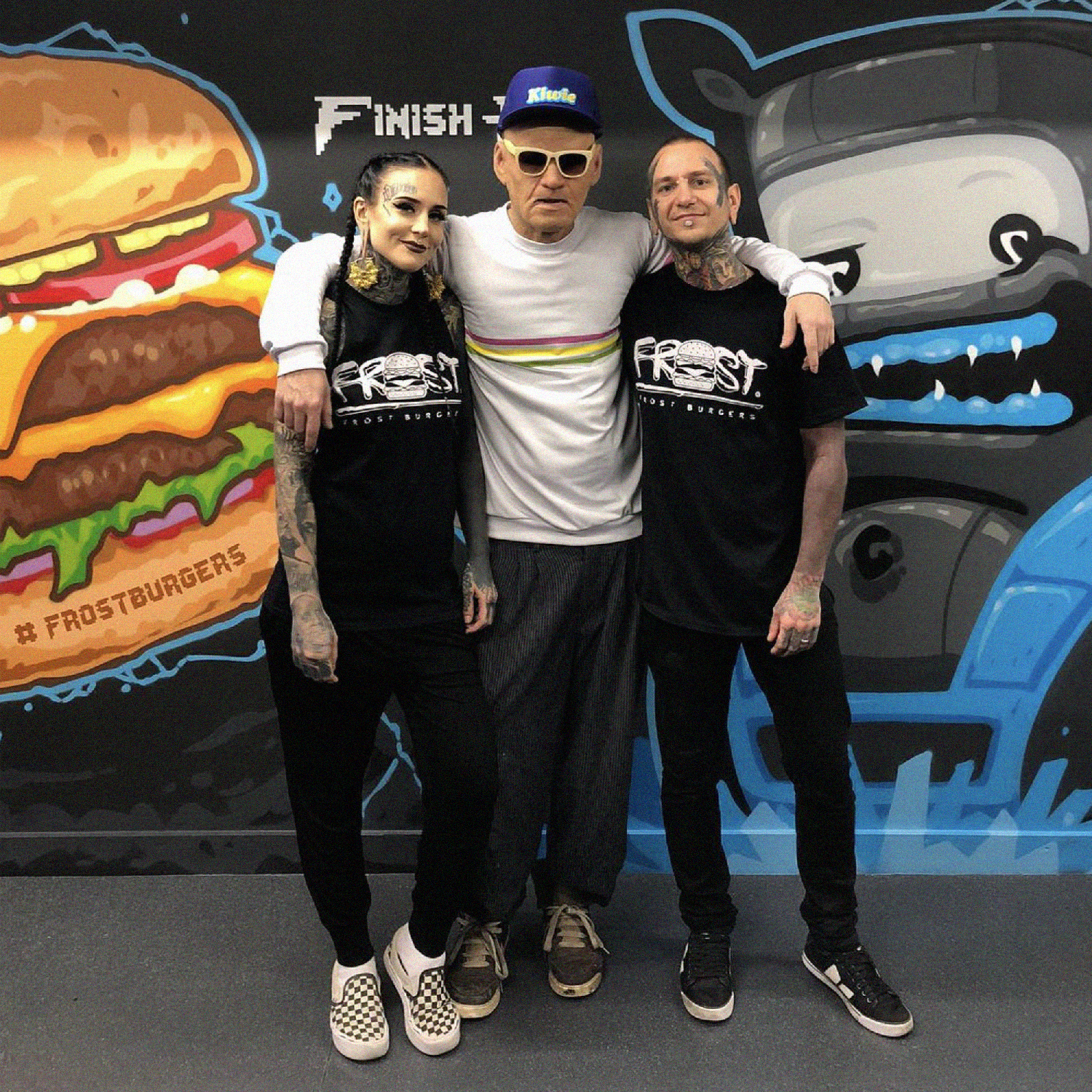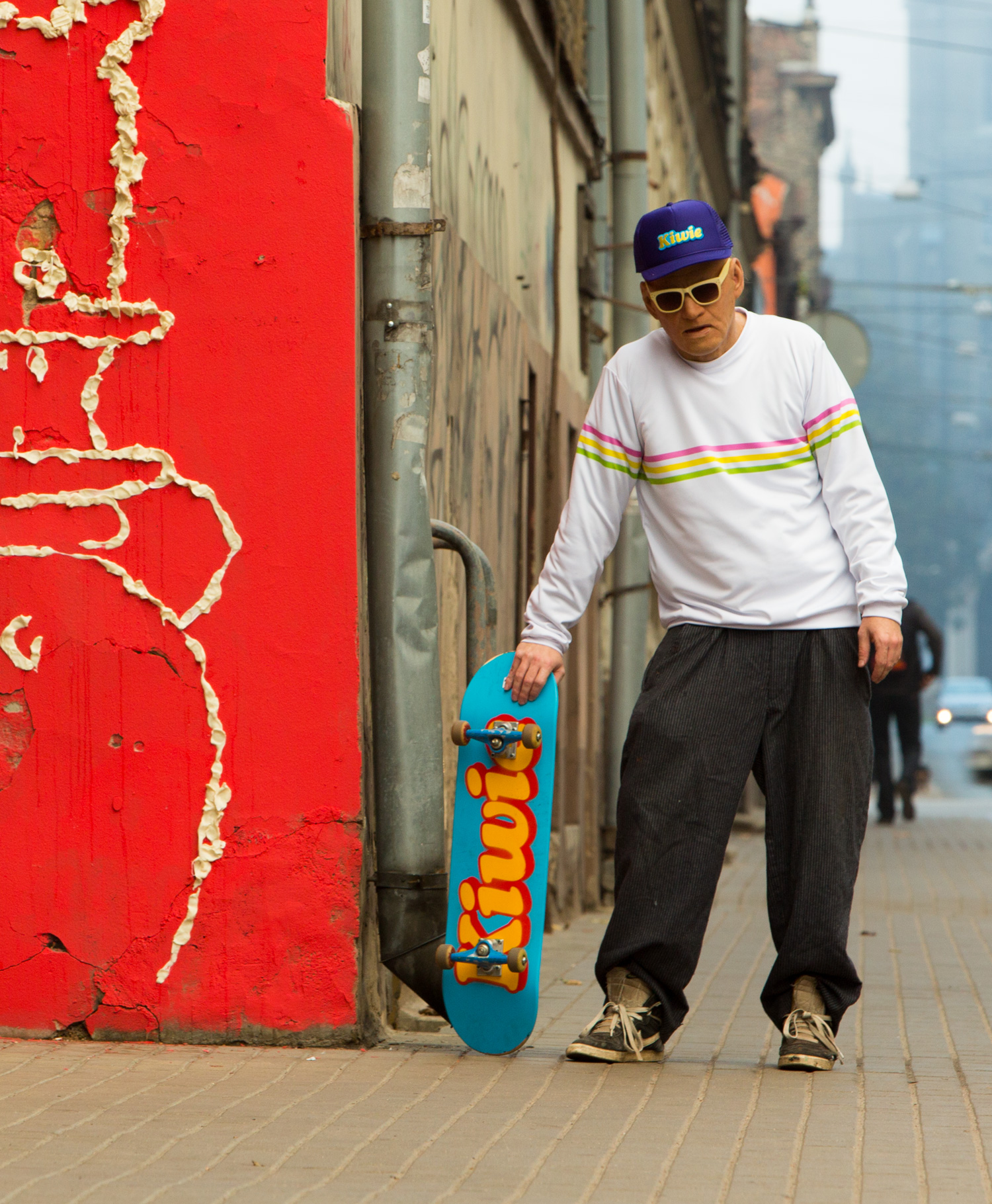 Grandpa went on another rampage, traveling across countries and painting every wall he could find. First, he hit Portugal, where I counted around twenty new artworks across the streets of Porto - about three to four pieces per day. Then he headed to Barcelona - same story. After that, he landed in Liverpool, United Kingdom, where he teamed up with Monami Frost to design and paint the first vegan burger joint, Frost Burgers. Shortly after returning home, he pulled together the first serious collection of new KIWIE accessories "KIWIE TURBO". One of his long-time dreams was to create bubble gums with KIWIE stickers inside. Since no bubble gum company responded, he did it himself - bought 1,000 Turbo bubble gums, rewrapped them in his own custom-designed paper, and yes, slipped stickers inside. During the process, he even made a street piece in broad daylight by chewing the gum and sticking it to a wall in the shape of a KIWIE monster. Here is more about the whole process.