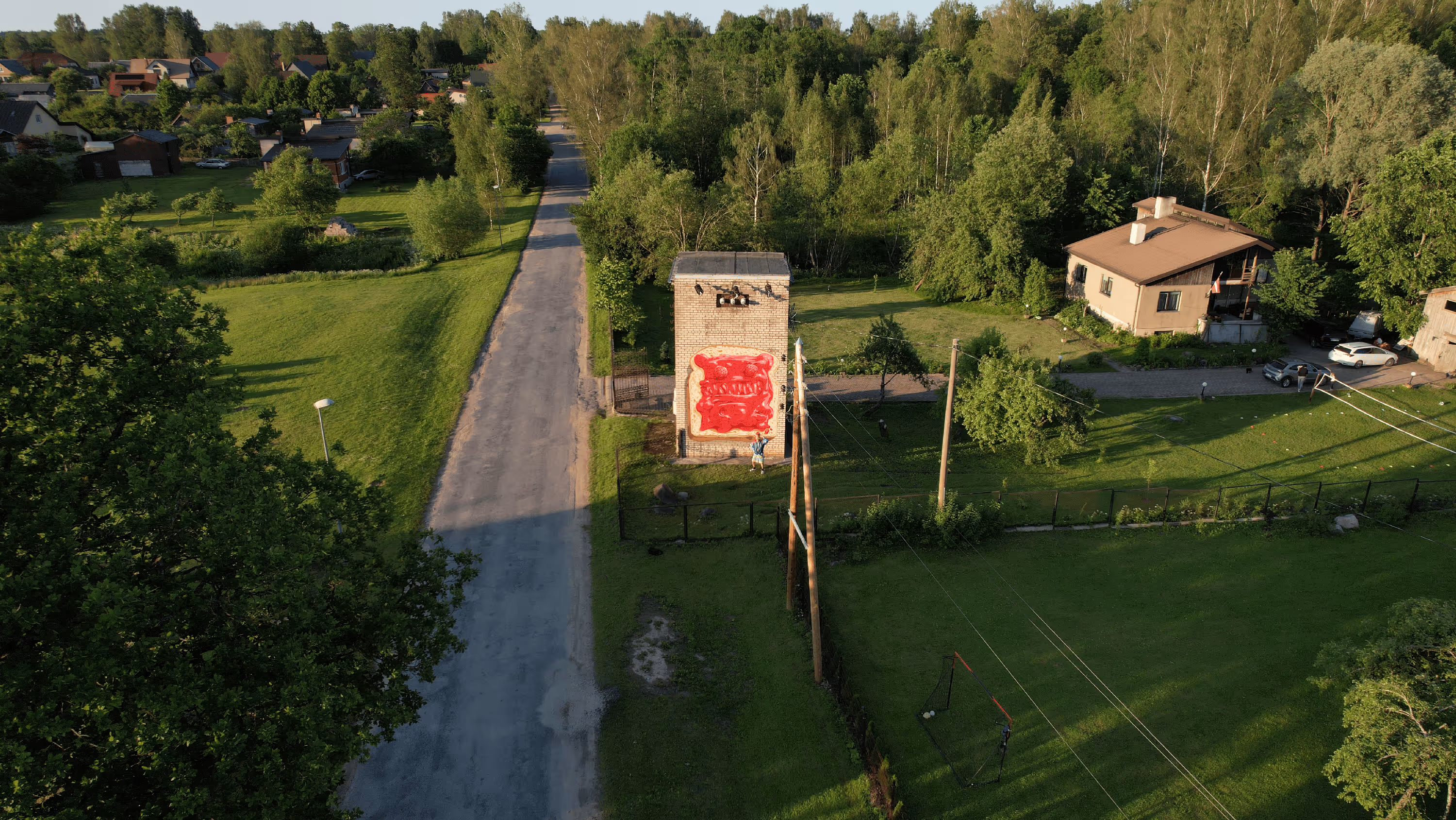 The concept of the strawberry toast came to Grandpa right after he first saw the location. He used to make funny faces on pieces of bread with butter or jam, so he decided that a giant toast with strawberry jam, shaped like one of his KIWIE monsters, would fit perfectly here. Grandpa completed the artwork despite the rainy weather. The frequent strawberry toasts and coffee delivered by the wall’s owners gave him a much-needed sugar boost. For the first time, Grandpa experimented with using concrete to smooth the old brick wall, creating a more convincing three-dimensional effect for the toast. To achieve the drop shadow, he layered transparent paint multiple times, carefully building it up until it looked like a real shadow. Finally, the artwork was coated with a protective layer to preserve its colors and shield it from sun and weather damage. You can see the whole process on grandpas IG account.