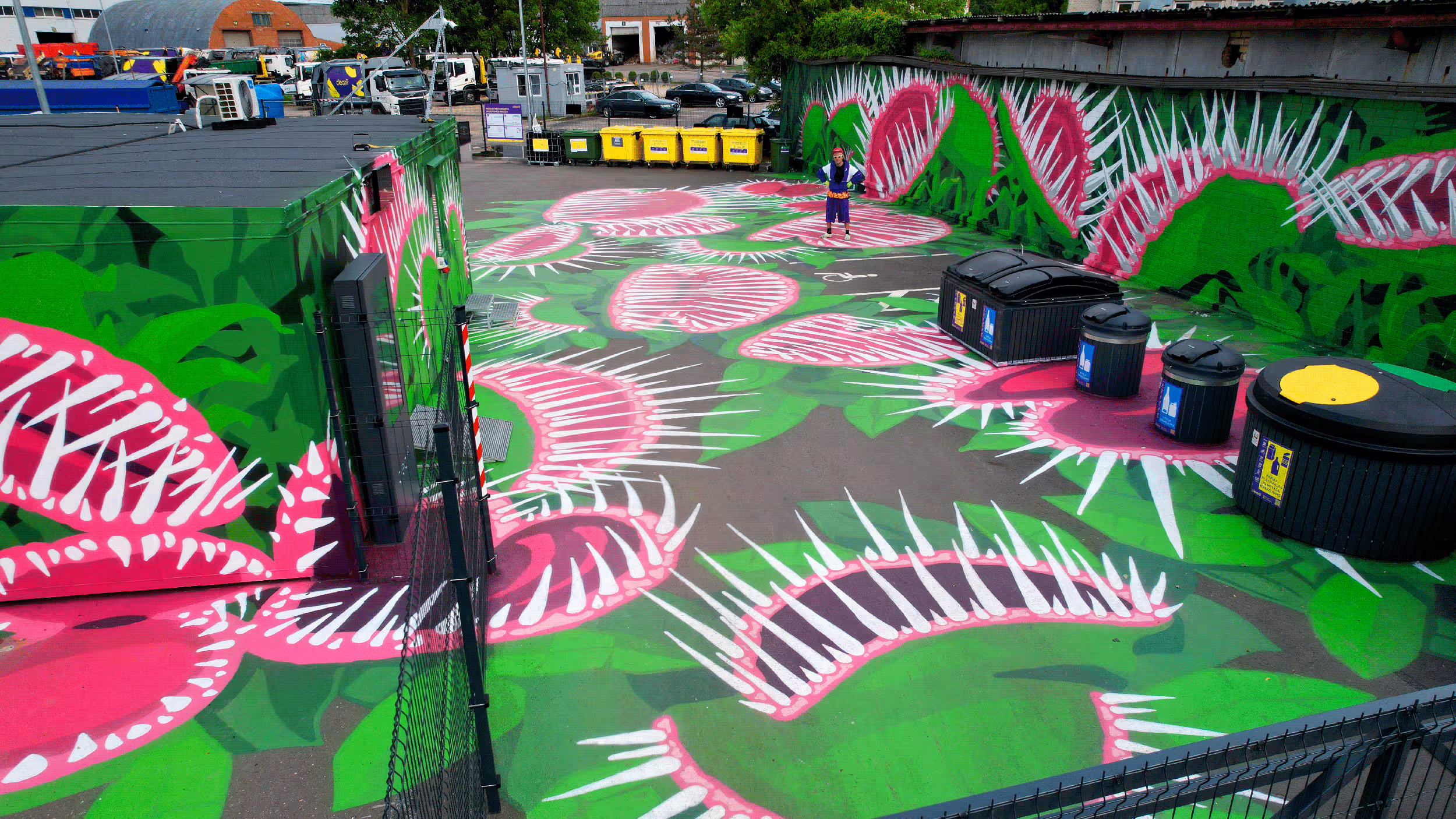 Grandpa was invited to paint "CleanR" the most modern sorted waste collection site in Riga, located at Vietalvas Street 5b. The mural spans roughly 550 square meters and complements the recently opened state-of-the-art facility. Grandpa on the concept: “Now the waste collection site is decorated with an artwork featuring a Kiwie-style interpretation of a well-known Latvian insect-eating plant - the sundew. In this case, however, the flower symbolically ‘eats’ trash.”