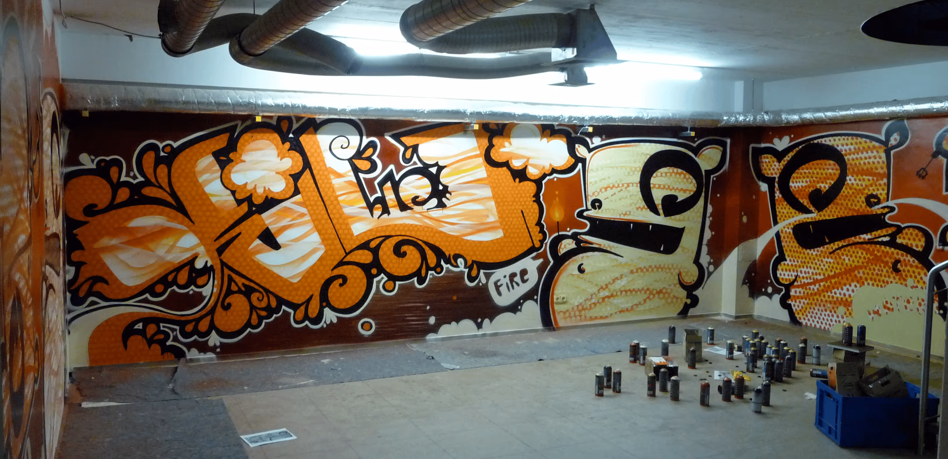 John stayed in Frankfurt hotel for free once, in return he painted some walls. Artwork probably still exists.